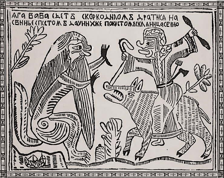 Очевидно, дальним родственником крокодила является славянский мифический каркаладил или коркодил. Он неоднократный персонаж лубочных картинок, а также страшный зверь из Псковской летописи 1582 года: «В лето 7090 (с сотворения мира) вышли коркодилы лютые, звери из реки и путь перекрыли, сожрав многих людей. И ужаснулись люди и молили Бога по всей земле». Сами историки с крокодилом каркаладила не ассоциируют, полагая, что здесь мы имеем дело с безусловно вымышленным животным, которое выходит из реки, затворяет путь и ест людей. Больше про него ничего неизвестно, кроме того, что на нем, по лубочным картинкам, часто разъезжает не менее мифическая Баба-Яга.