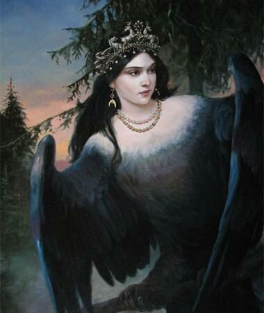 Сирин в древнерусском фольклоре — большая, сильная, пестрая дева-птица с большой грудью, строгим лицом и короной на голове.